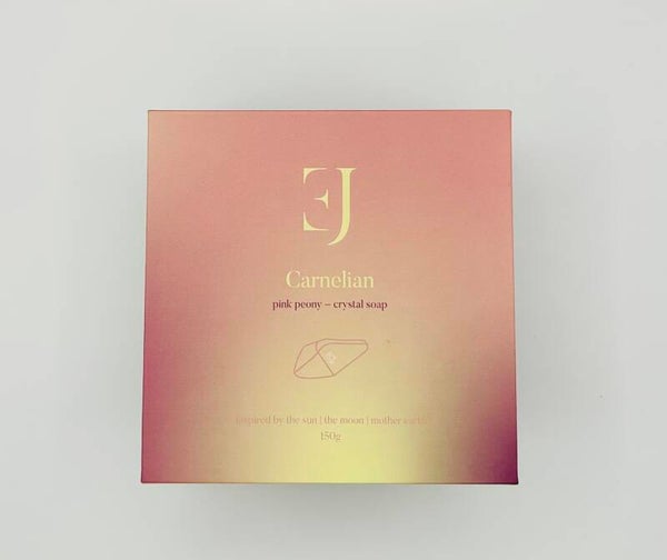 Laat je energie ontwaken met de Carnelian zeep van ExcluJess. Deze handgemaakte edelsteenzeep straalt warmte en passie uit dankzij de levendige oranje tinten en de betoverende geur van roze pioenroos. Een dagelijkse boost van zelfvertrouwen, verpakt in pure elegantie.